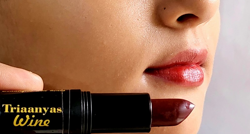 “Wine Natural Lipstick by Triaanya’s combines stunning natural tints with healing ingredients like Lauh Bhasm, Almond Oil, and Beeswax. This lipstick not only enhances your lips with a beautiful red hue but also nourishes and hydrates. Available in a vegan formula for cruelty-free care.”